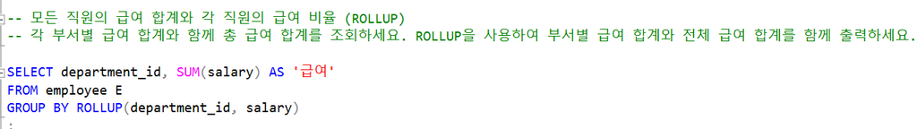 - 그룹 컬럼으로 지정된 컬럼에 대하여 소계와 합계 집계