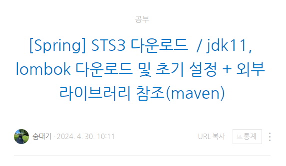 | [Spring] STS3 다운로드 / jdk11, lombok 다운로드 및 초기 설정 + 외부 라이브러리 참조(maven) (24.04.30) (0) | 2024.08.27 |