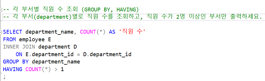 2. 각 부서별 직원 수 조회 (GROUP BY, HAVING)