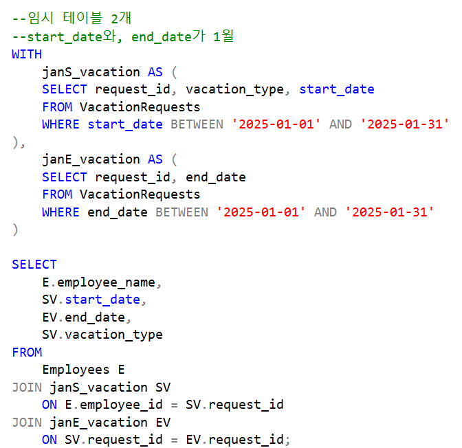 CTE : jan_vacation 임시 테이블에 휴가 정보 저장(1월 start)