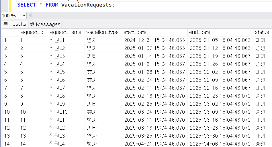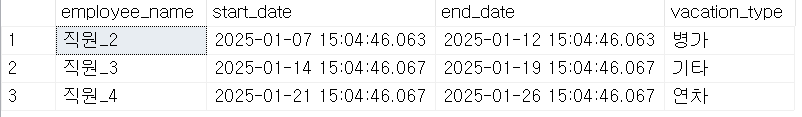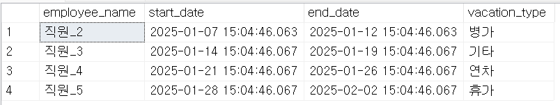 SELECT : 직원의 이름, 휴가 기간(start/end), 유형 출력