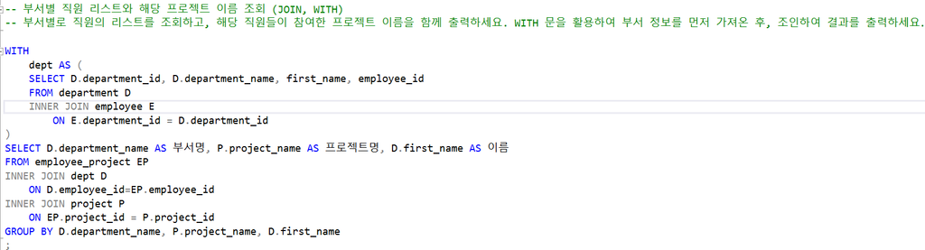 8. 부서별 직원 리스트와 해당 프로젝트 이름 조회 (JOIN, WITH)