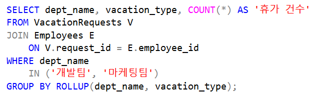 ROLLUP(dept_name, vacation_type) : 그룹화 된 결과에 누적된 합을 추가