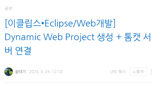 | [이클립스•Eclipse/Web개발] Dynamic Web Project 생성 + 톰캣 서버 연결 (24.04.24) (0) | 2024.08.27 |