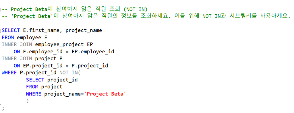 9. Project Beta에 참여하지 않은 직원 조회 (NOT IN)